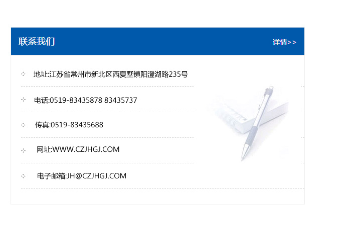 地址:常州市新北區友邦商務大廈1幢16、17層  電話:0519-85101652  傳真:0519-85112595  郵編:213022  網址:www.cz-jiayue_cn.lexin1688.com  郵箱:xiajifengaa@163.com